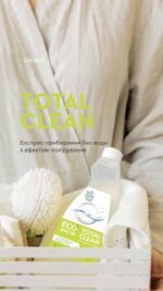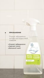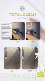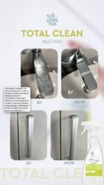 Total Clean — універсальний екозасіб для щоденного догляду за будь-якими водостійкими поверхнями. Видаляє жир, вапняний наліт, плями їжі та усуває запахи. Працює швидко, не залишає розводів, не потребує змивання. Безпечний для шкіри та навколишнього середовища.