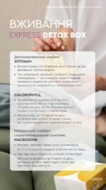 EXPRESS DETOX BOX — це потужне, але м’яке рішення для детоксикації організму, відновлення енергії, мікрофлори й покращення самопочуття вже в перші дні після курсу. Ідеально підходить при харчових і алкогольних отруєннях, після застуд, ГРВІ, стресу, прийому антибіотиків чи гормональних препаратів.