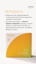 О.К. — збалансований комплекс для підтримки здоров’я опорно-рухового апарату. Ідеально підходить у період підвищених фізичних навантажень, менопаузи, після переломів або для профілактики остеопорозу.