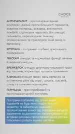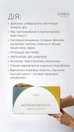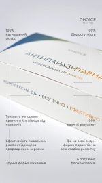 Антипаразитарна програма Choice — це системний підхід до очищення від гельмінтів (круглі, пласкі, стрічкові), лямблій, трихомонад, амеб, токсоплазм, грибків і умовно-патогенної флори. Вона усуває не лише дорослих паразитів, а й їхні яйця, личинки та продукти розпаду, запобігаючи повторному інфікуванню. Завдяки багаторівневому складу формула одночасно очищає, відновлює й підтримує організм.